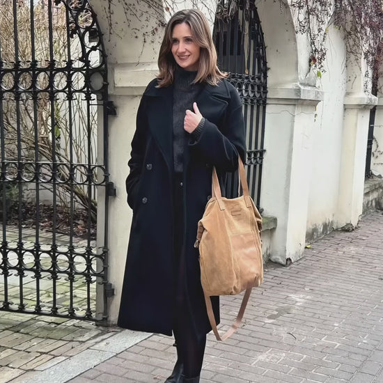 Eine originelle, große Schultertasche, handgefertigt aus italienischen Wildleder. 3in1 - Diese Tasche, die sich sowohl als Schultertasche als auch als Umhängetasche und - dank des langen Trageriemens - auch als Crossbody-Tasche.